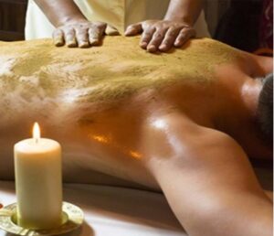 Abhyanga è un massaggio con olio caldo medicato dalla testa ai piedi. Inizia con testa, collo e spalle, seguito da tutto il corpo. Comporta lunghi movimenti eseguiti lungo il contorno del corpo con ritmo, flusso e pressione specifici.